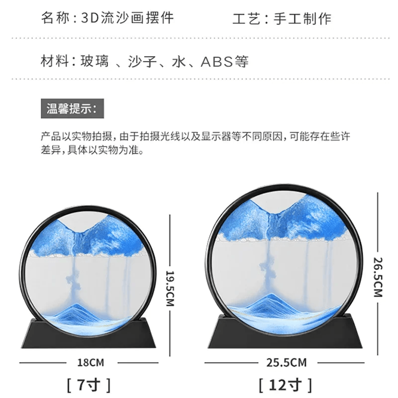 - The 3D sand glass lamp can rotate a full 360°, allowing you to change sides effortlessly. With each turn, the fine quicksand creates a captivating new image. Simply remove the upper part, flip it over, and reinsert it to refresh the sand painting, making each viewing experience unique. The different weights of the sands produce stunning visual patterns as they flow.